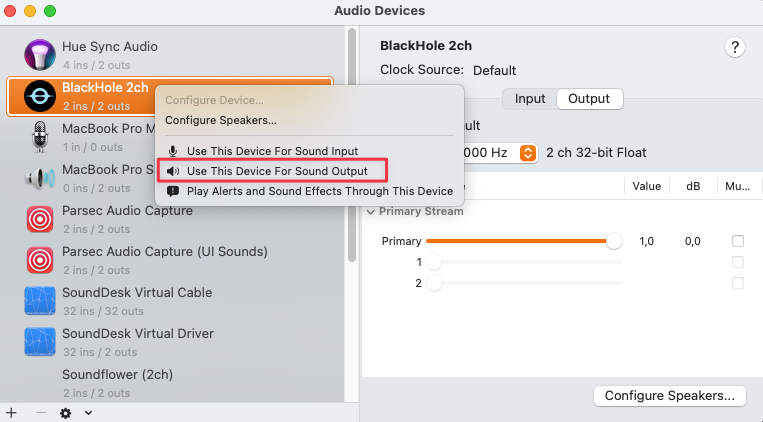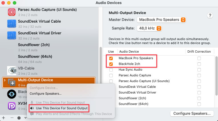 On macOS, you can create a Multi-Output device in order to output to multiple audio devices.
